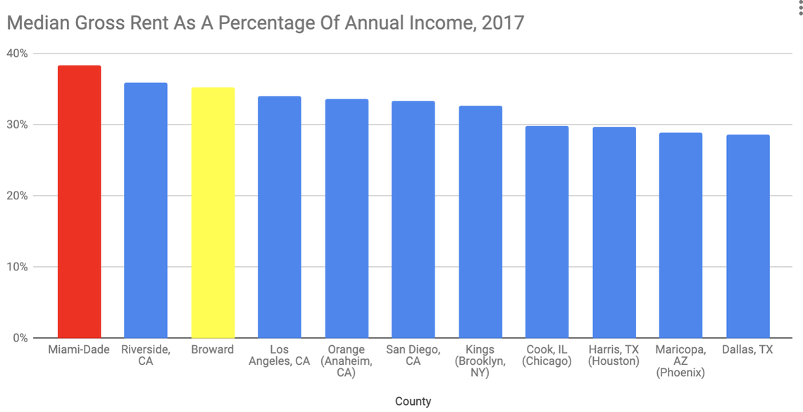 In 2017, Miami-Dade renters spent more than 38 percent of the median household income on rent. That made renting here more expensive than the counties that are home to Los Angeles, Brooklyn, N.Y., and Chicago.