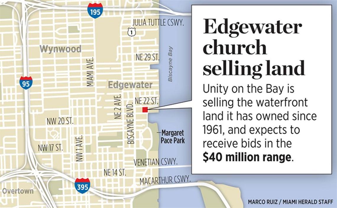 With land prices soaring in Miami, a nondenominational church plans to sell a two-acre bayfront plot in Edgewater that has been its home since 1961.