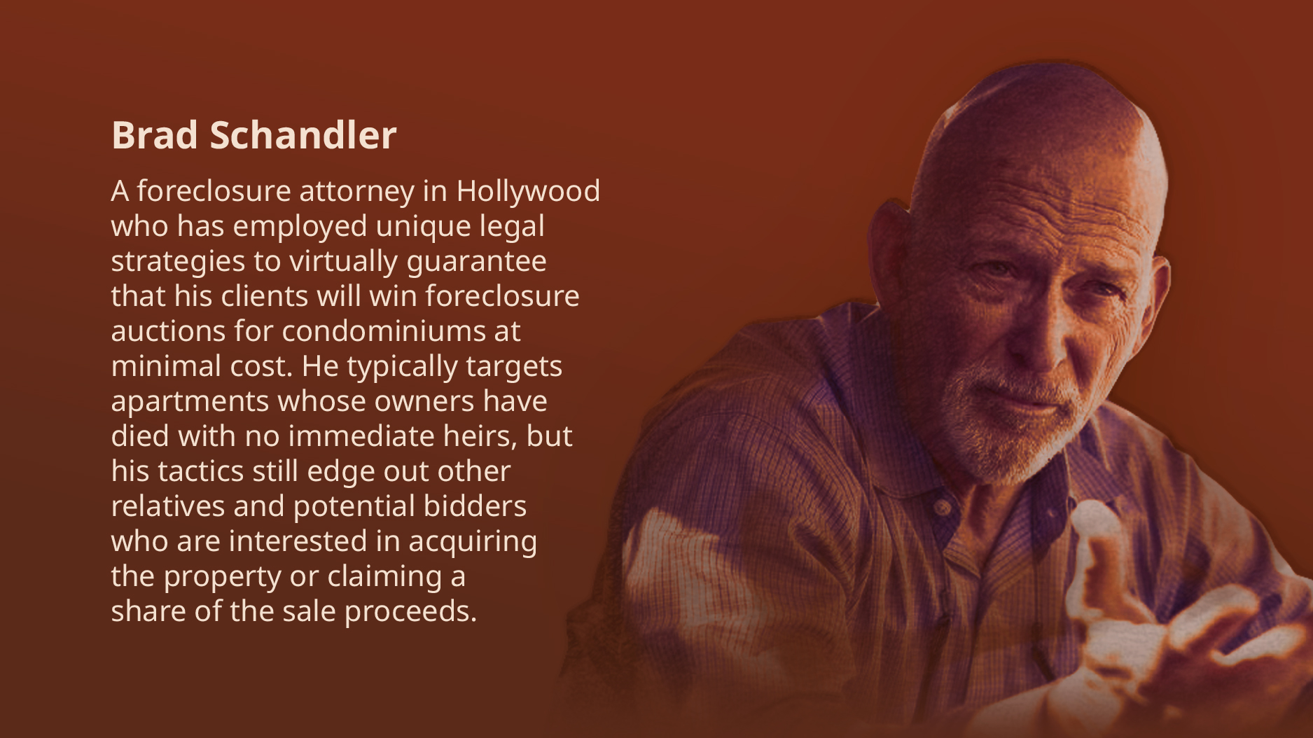 Schandler and his network typically pursue properties owned by the estates of people who have died and whose mortgages were fully paid off, leaving no banks to complicate an otherwise simple proceeding. In some cases, owners or heirs live in other countries. The properties are often in foreclosure over unpaid condo assessments or fees.