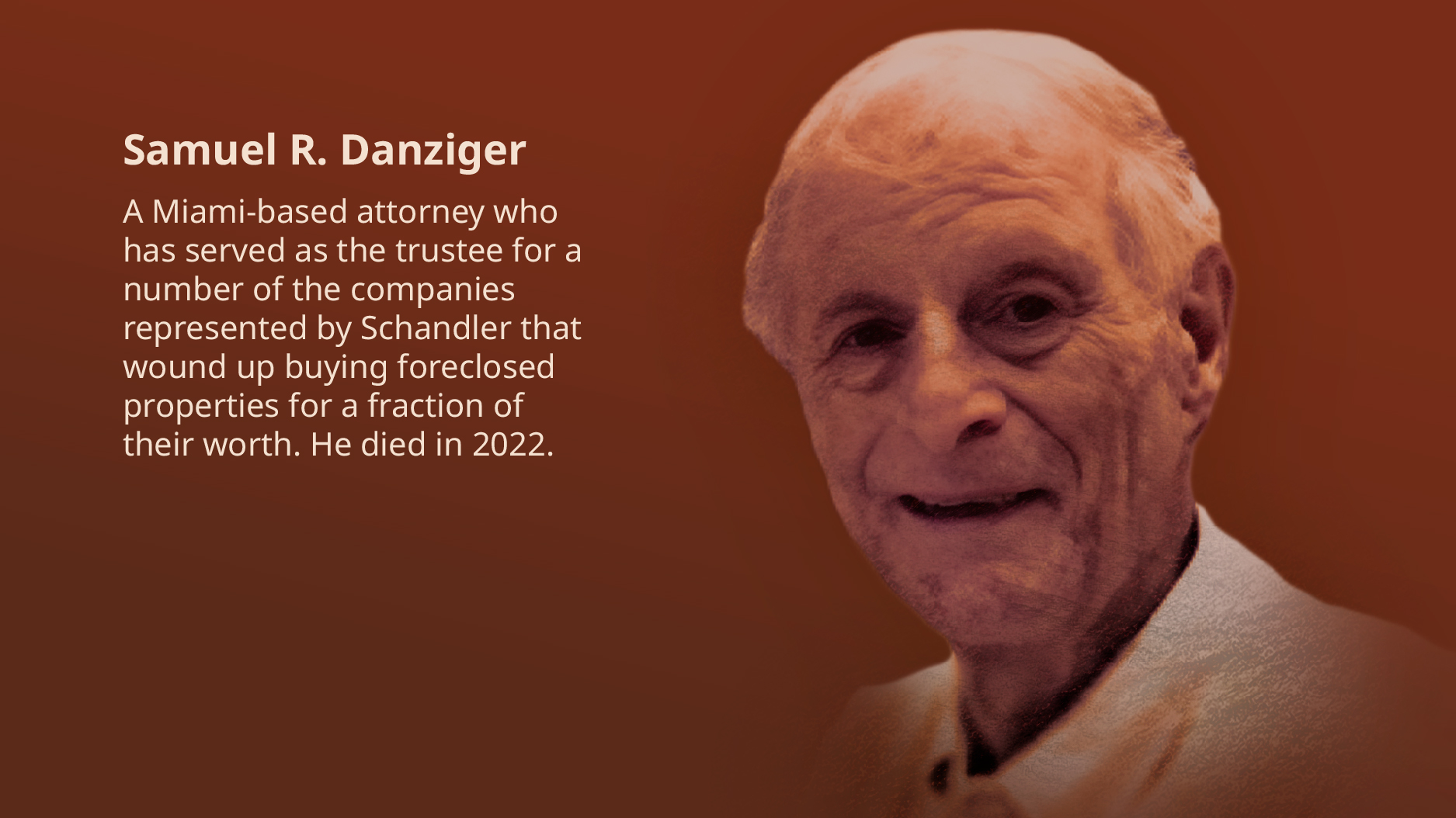 In November 2017, Schandler tried to intervene in a Fort Lauderdale condo foreclosure, saying he represented a trust affiliated with Samuel Danziger that paid the cremation costs of the condo’s owner, Susan Koskey. He said the trust was assigned the right to collect that debt.