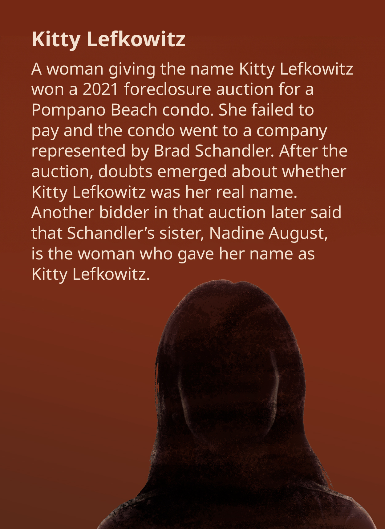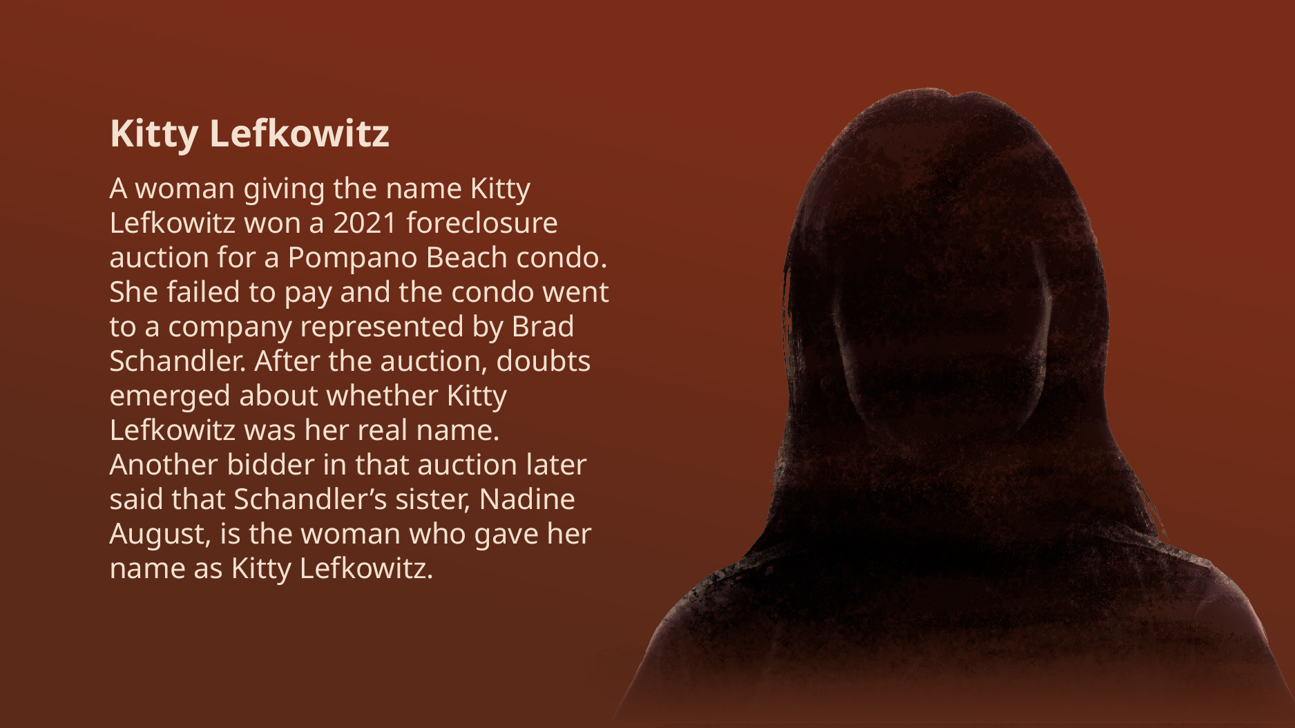 Right before the auction was to start on a two-bedroom Pompano Beach condo with ocean views, a woman showed up and said her name was Kitty Lefkowitz.