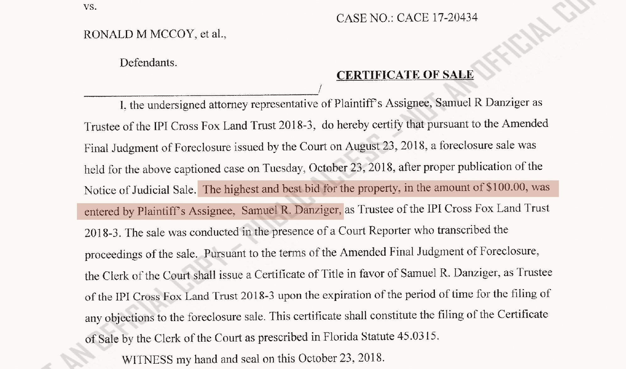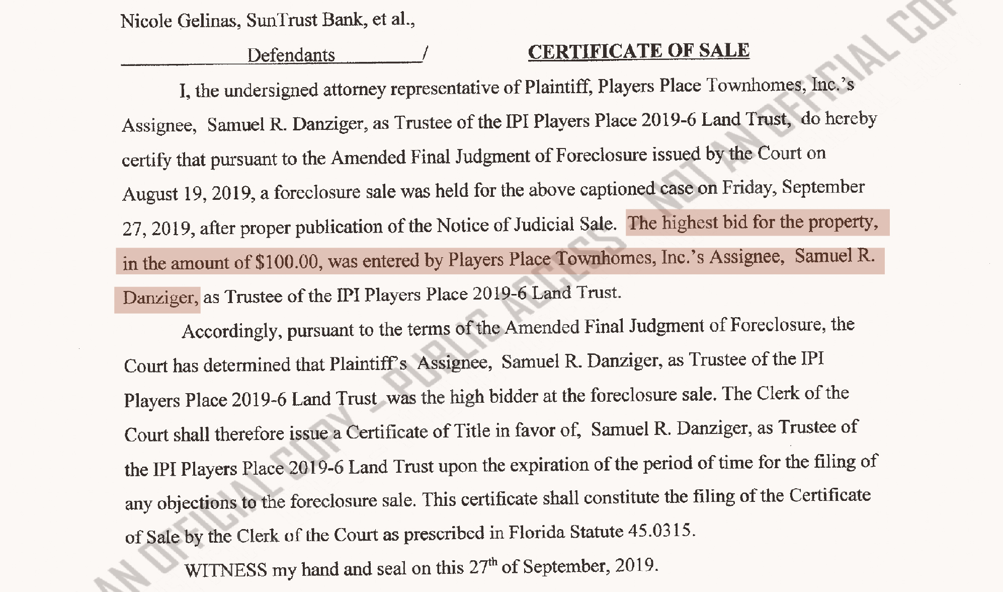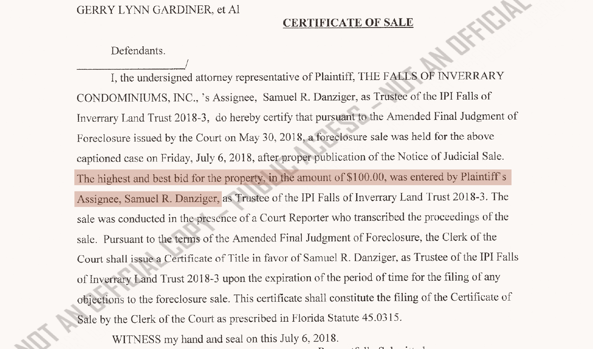 The next day, Katz didn’t pay the $430,000. So, by the terms of the auction approved by Miami Circuit Court Judge Renatha Francis (now on the Florida Supreme Court), the ownership of the condo went to Schandler’s client, atrust connected to Danziger.