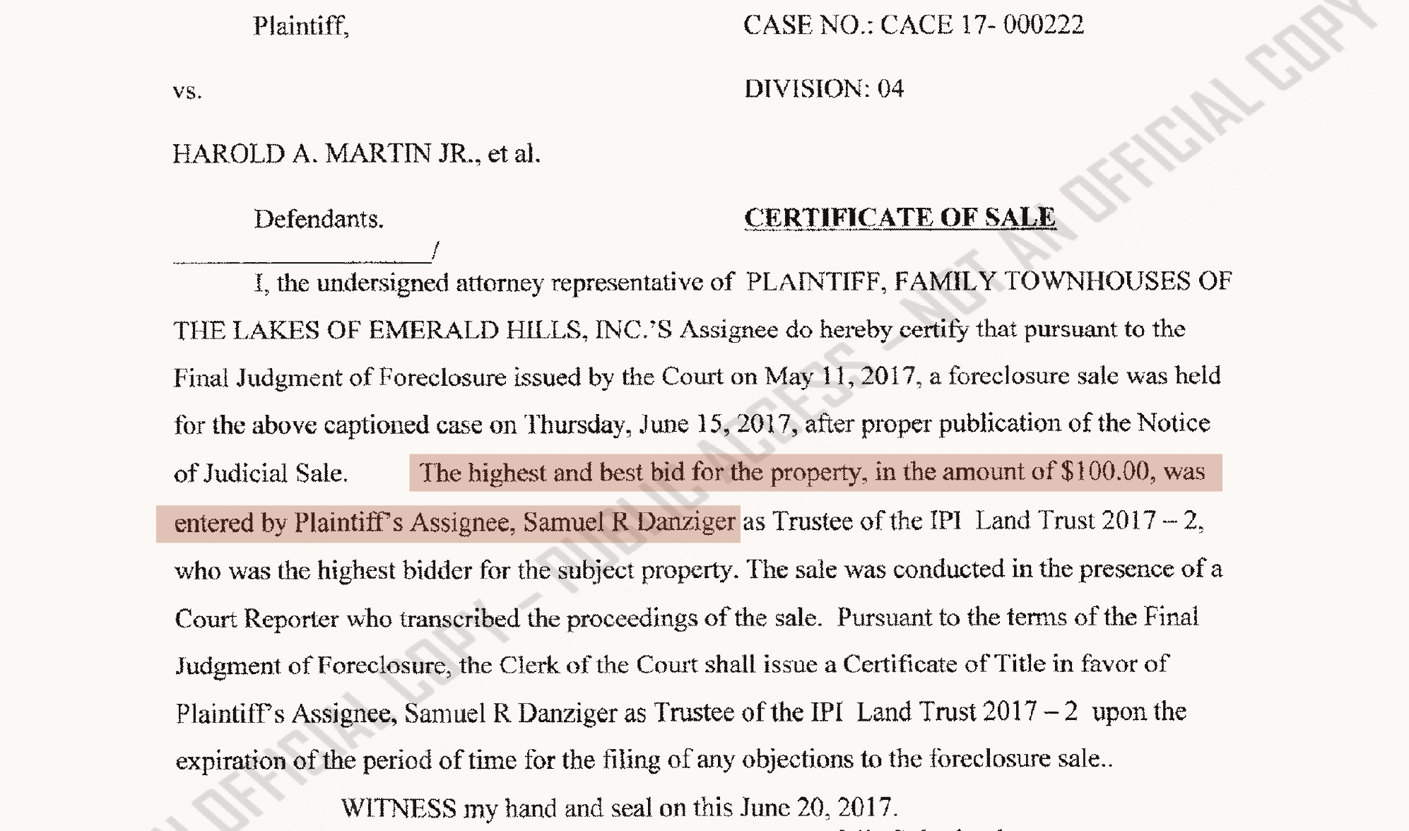 Schandler’s client won the auction for $95,800, beating out numerous other bidders, including one who bid $95,700. Court records show that the bidder name associated with that winning bid was Adonai Lee, which translates to the “Lord is with me” in Hebrew. While the same bidder name, Adonai Lee, was associated with the winning bid in at least two other auctions won by Schandler’s clients, Schandler said in a statement that the name was listed incorrectly and that he “was not responsible for these forms, prepared by the clerk.”