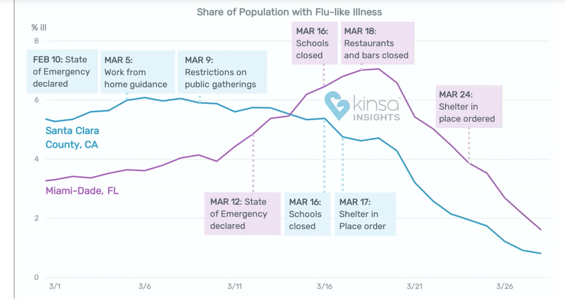 “The early and aggressive social distancing orders for Santa Clara were able to slow the spread of the disease and reduce illness throughout the county,’’ the Kinsa researchers conclude in a report on their website. The slower pace of Miami-Dade may have allowed the virus to saturate more of the community.