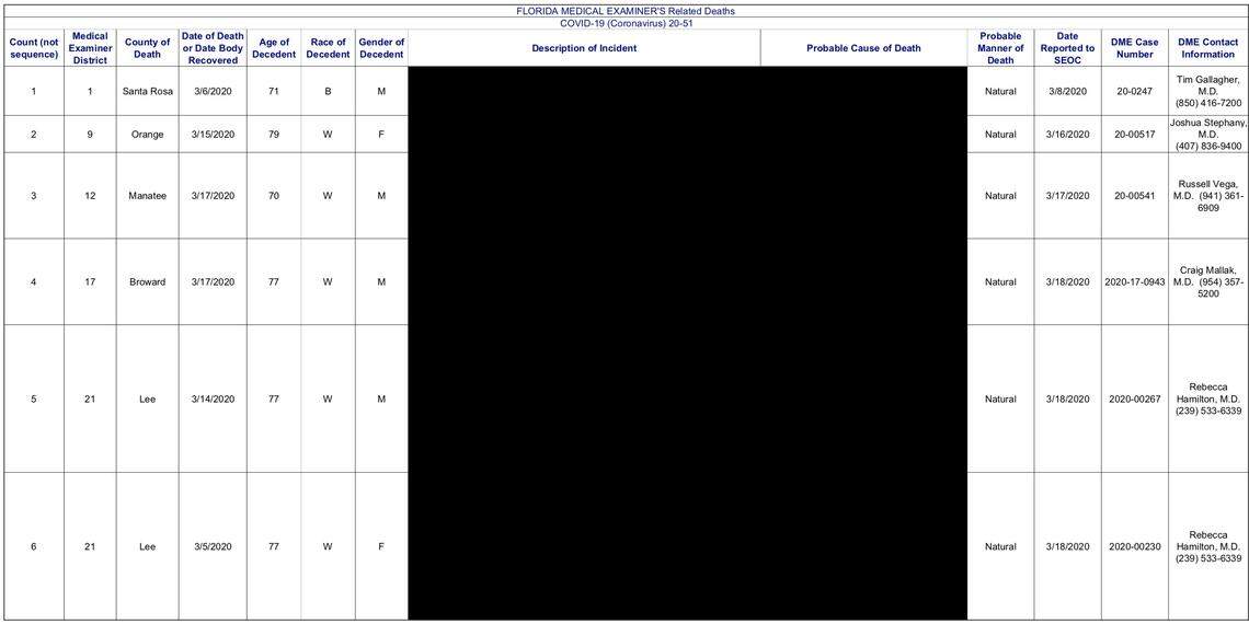 The records had previously been released by the state Medical Examiners Commission — until the Florida Department of Health told the commission to stop providing the list to the public. State health regulators said information from the spreadsheet needed to be redacted. They pointed to two columns in the spreadsheet that contain a description of the manner of death and the probable cause. (Individual medical examiners around the state do not redact that information in response to public records requests.)