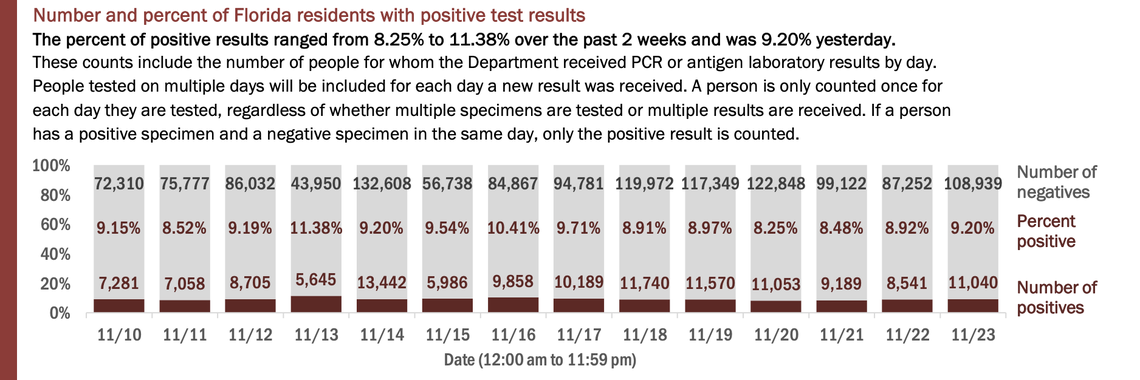 On Tuesday, Florida’s Department of Health reported the results of 119,979 people tested on Monday. The positivity rate of new cases (people who tested positive for the first time) increased from 7.02% to 7.47%.