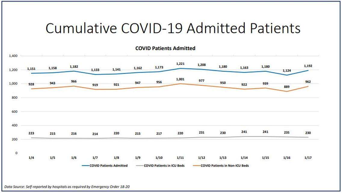 The Florida Agency for Health Care Administration reports the number of patients hospitalized statewide with a “primary diagnosis of COVID.” The data, which is updated at least every hour, does not distinguish between the number of COVID-19 patients in hospital intensive care units and those in acute-care beds, which require less attention from nurses.