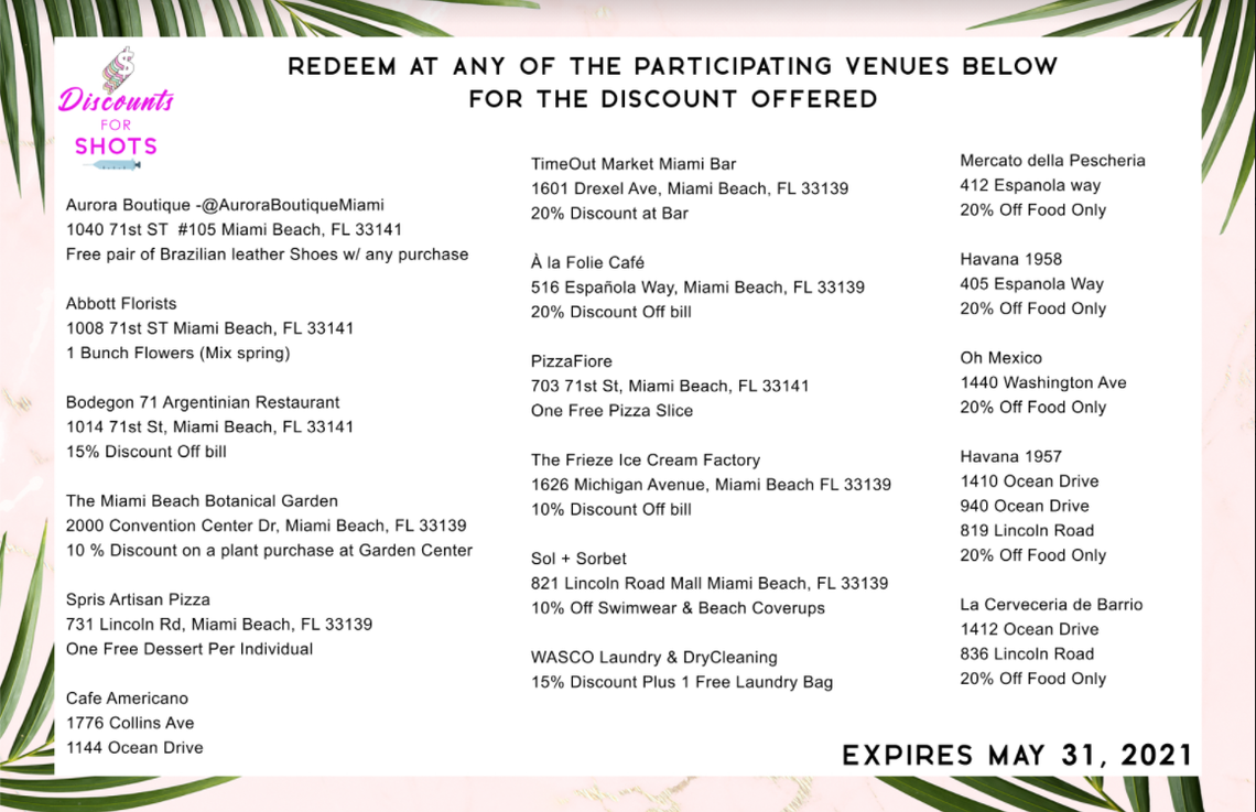From food and drink deals to a free pair of Brazilian leather shoes, more than two dozen Miami Beach businesses have agreed to offer discounts to those who get the COVID-19 vaccine at a state-run vaccination site across from City Hall.