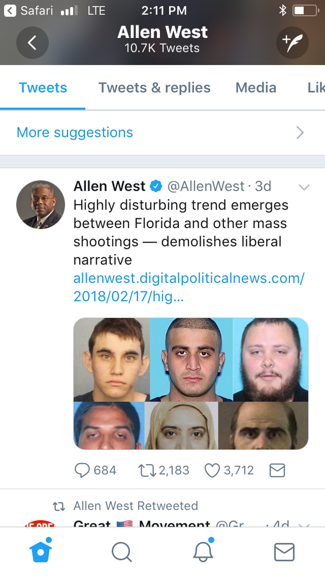Former U.S. Congressman Allen West, a Republican who served a single term in South Florida as a Tea Party star, also joined in. In one Twitter post, he lumped shooter Nikolas Cruz with five Americans of Middle Eastern descent who claimed connections to terrorist groups. There is no indication that 19-year-old Cruz, who state records show has lived much of his life in Broward County, was a follower of any Muslim terror group.