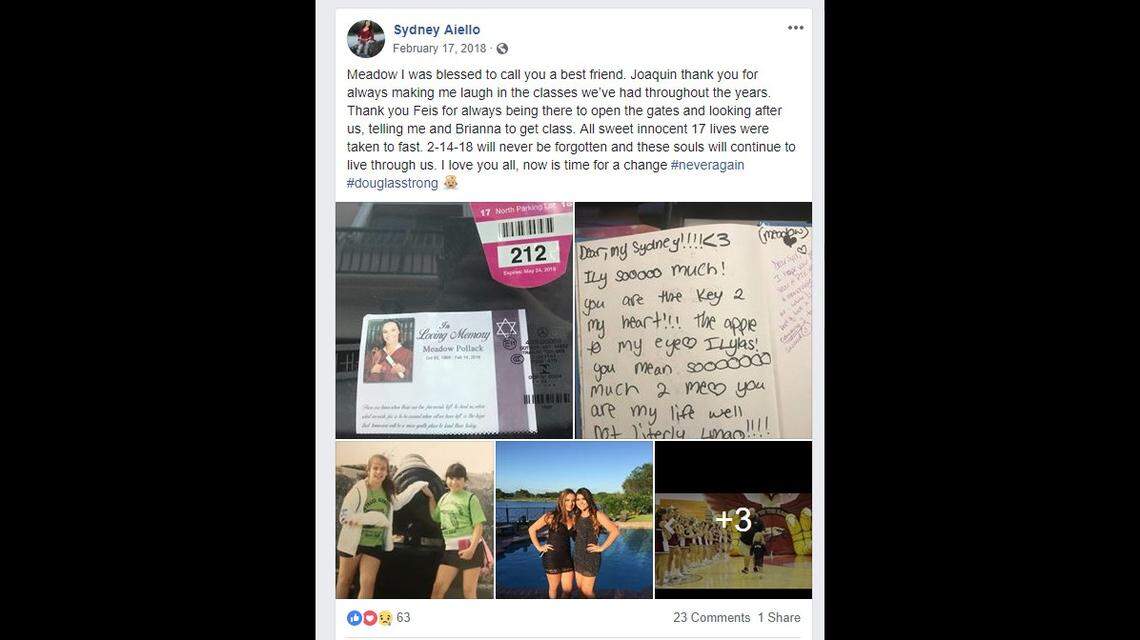 Among the victims of the shooting was Aiello’s longtime friend, Meadow Pollack. Aiello was also friends with Joaquin Oliver, 17, another student killed in the shooting. She wrote lovingly about both on her social media following their deaths.