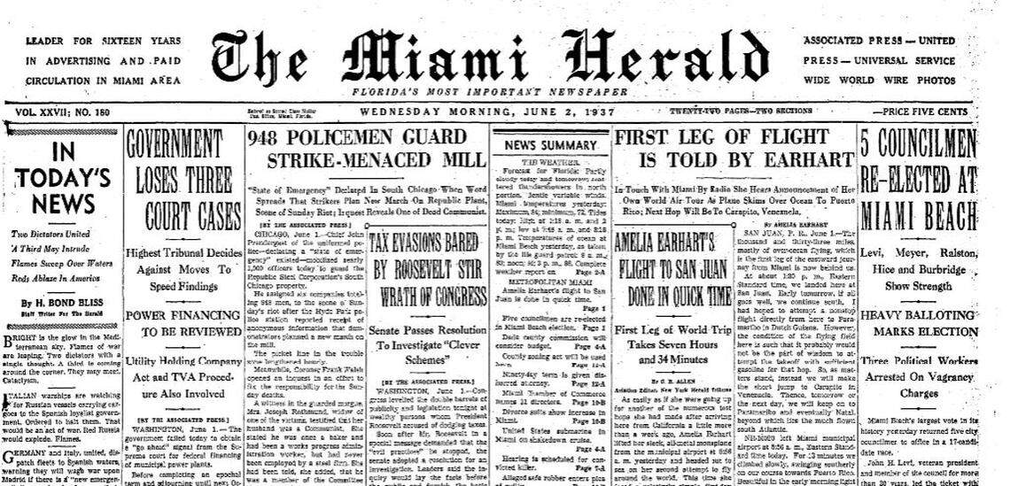 Earhart took off from a Miami-area airport on June 1, 1937, on her fatal flight. Here is a look at the events through the archives of the Miami Herald.