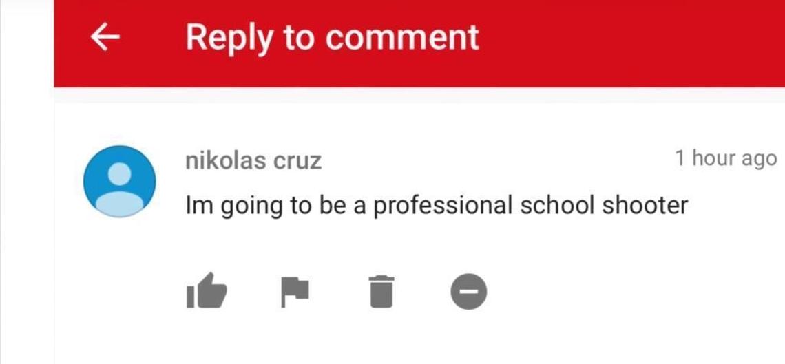 The comment, posted in September on a YouTube page of a Mississippi bail bondsman, was made by someone with the user name “nikolas cruz.”