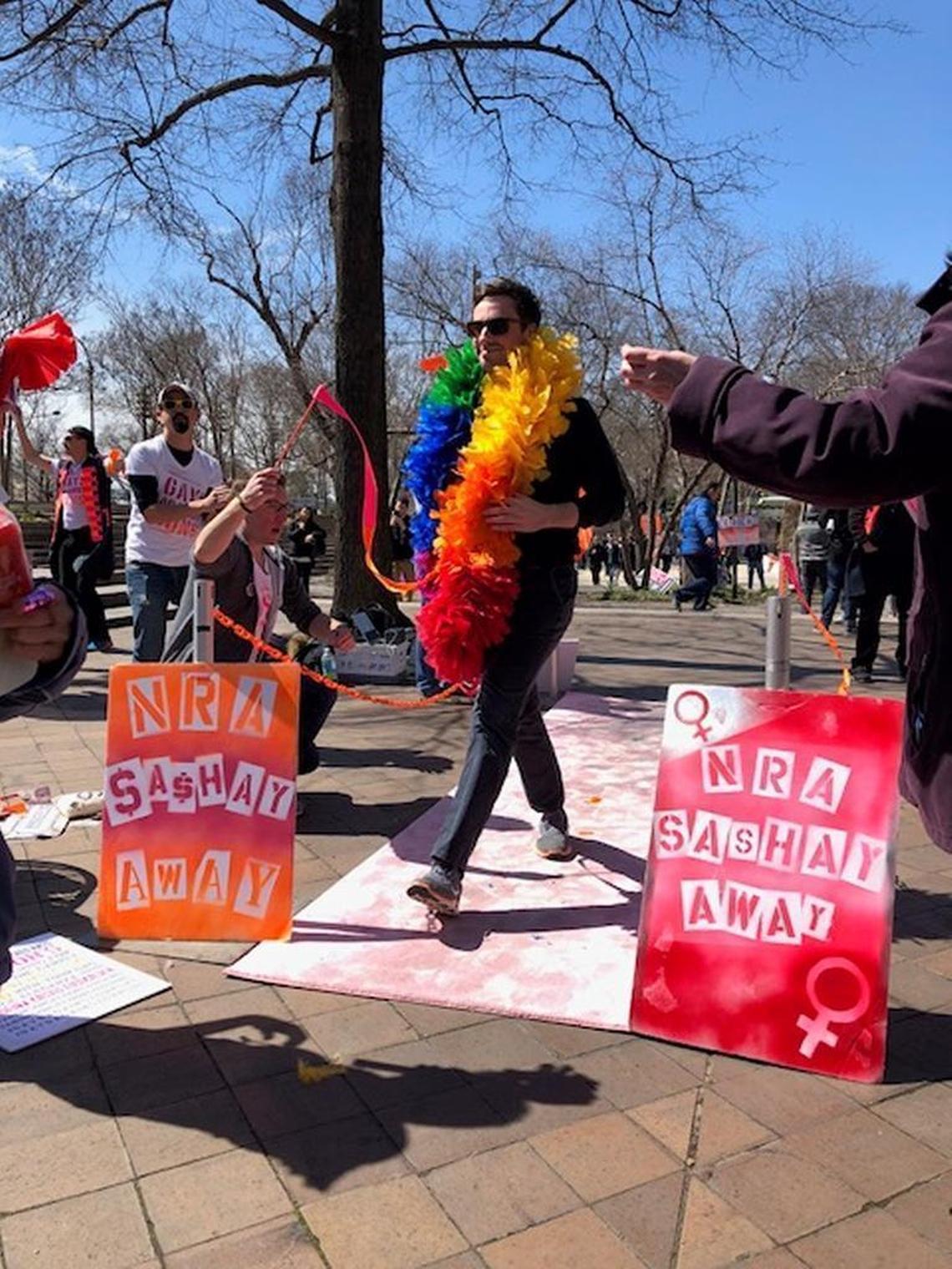 Not everything at the March For Our Lives has a somber tone. Near the entrance of the march, just a block from the White House, a group called Gays Against Guns has set up a mock runway to “sashay away” the NRA.