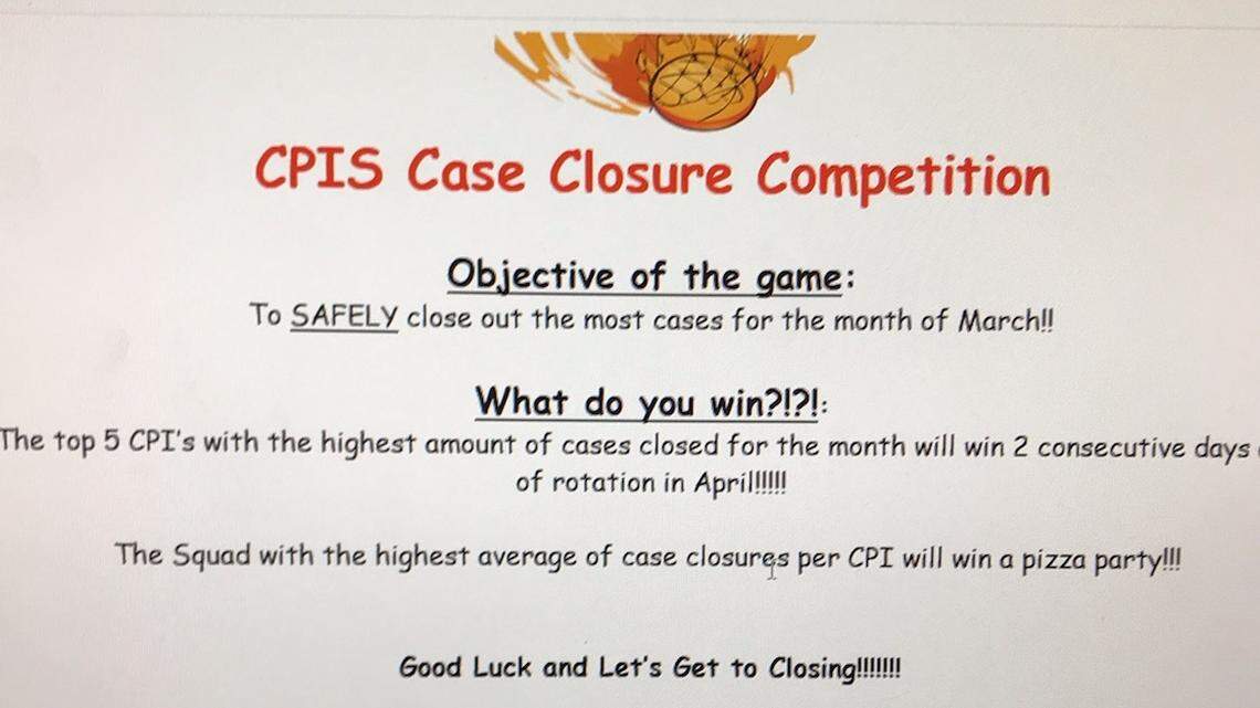 “The squad with the highest average of case closures per CPI will win a pizza party!!!” the announcement said.