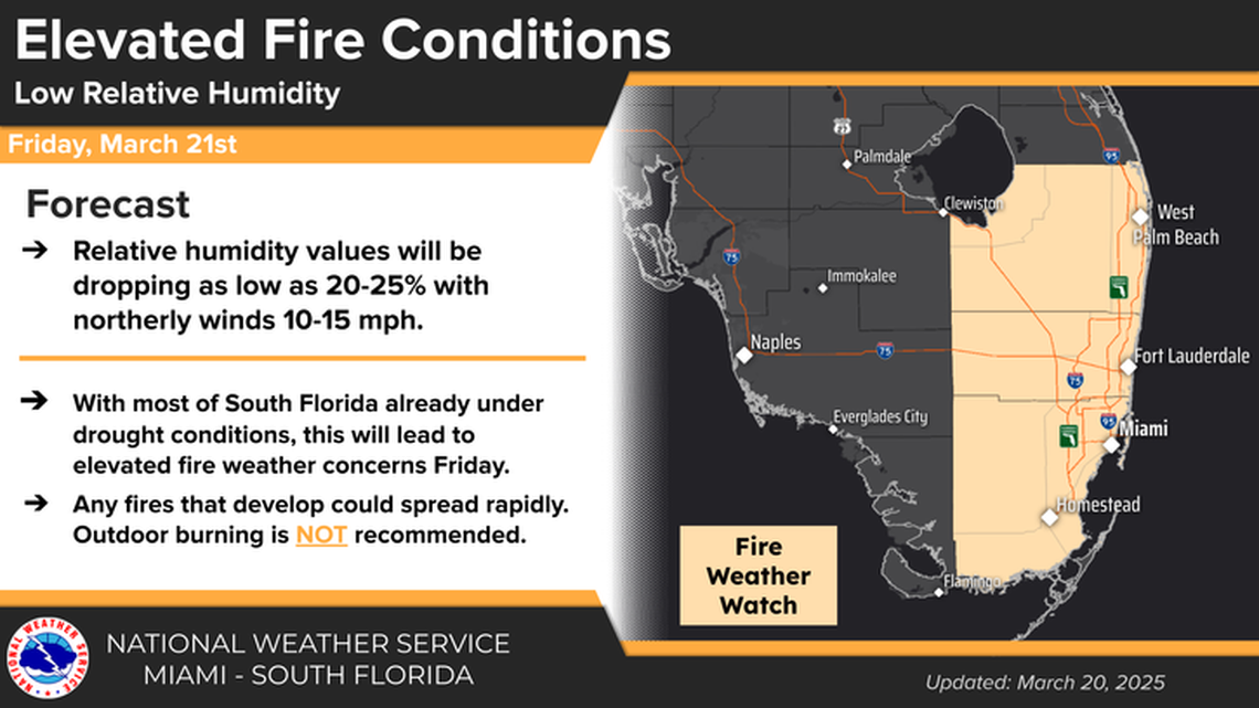 By Thursday night, forecasters issued a fire weather watch that will take effect Friday morning through the evening for Miami-Dade, Broward and Palm Beach.