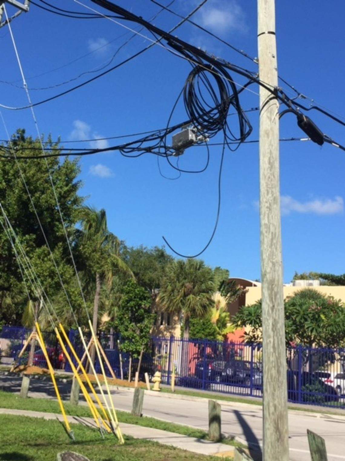 “This is very dangerous for my children and ugly for my house,” said Maria Mendez, who lives on Northeast Fifth Avenue near Northeast 74th Street. A splice case and cables have been strapped with yellow caution tape to a wooden utility pole and palm tree on her swale for months. Her children and probably her dog could have done a neater job.