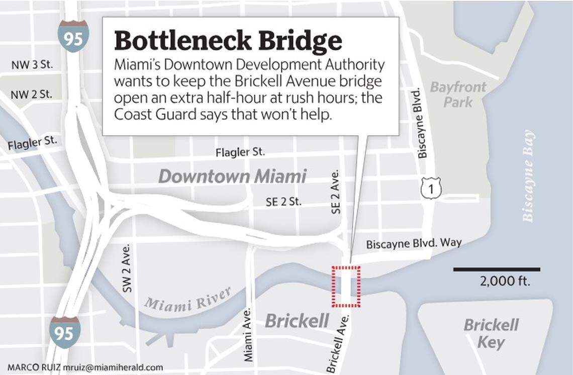 The Brickell bridge causes backups each time it opens during peak periods. Tension between those in cars on land and those in boats on the water has grown as the downtown population has swelled by 40 percent since 2010. Business owners, commuters and residents want extended bridge closure times during morning and evening rush hours.