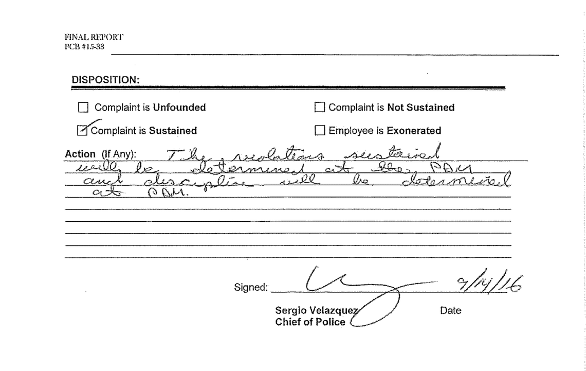 Velázquez, the Hialeah police chief, did not discipline Menocal despite formally sustaining the internal affairs complaint on Sept. 14, 2016. The chief later gave Menocal a full-time assignment at Miami Dade College’s police academy.