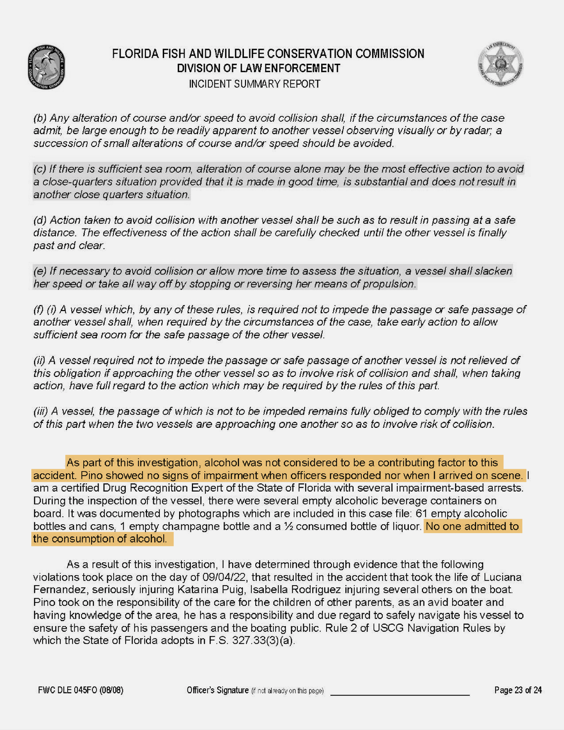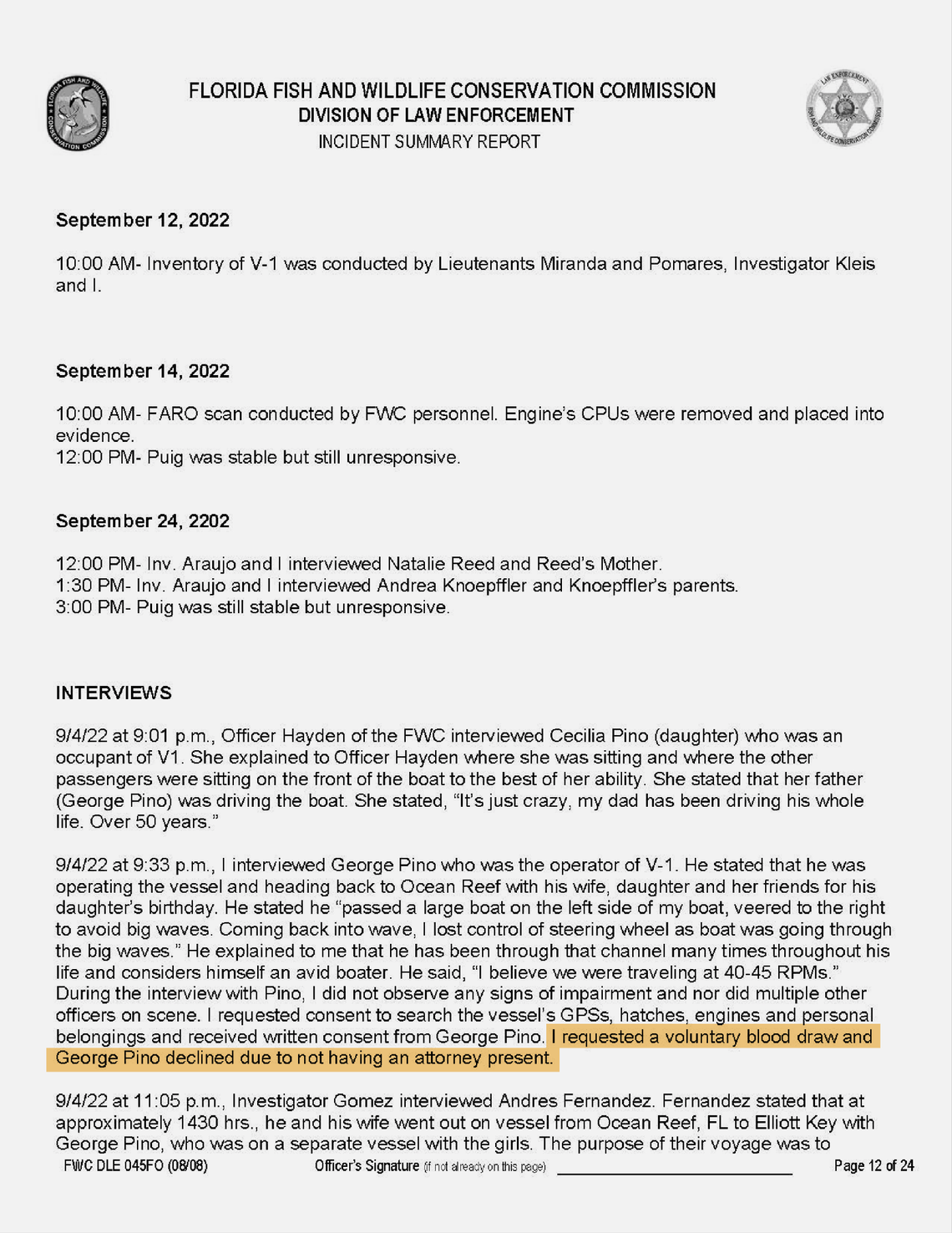 Despite no sobriety test of Pino, it took less than seven hours for Thompson, a certifieddrug recognition expert,to rule out alcohol as a factor in the crash, which occurred at 6:37 p.m. on Sept. 4, 2022, the Sunday of Labor Day weekend. Shortly after midnight, at 1:06 a.m., Thompson emailed a one-page document, known as the FWC’s 24-hour report, to his supervisor, FWC emails show.