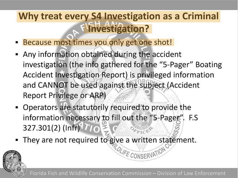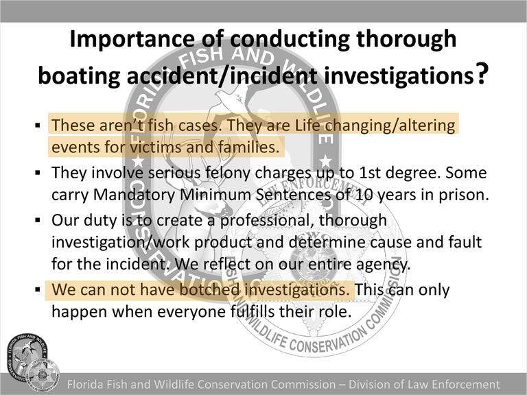 “Treat every accident investigation as criminal until [it’s] not … Because most times you only get one shot!” reads a key passage from a 2024FWC training presentation of boating investigations, one of scores of documents reviewed by the Herald.