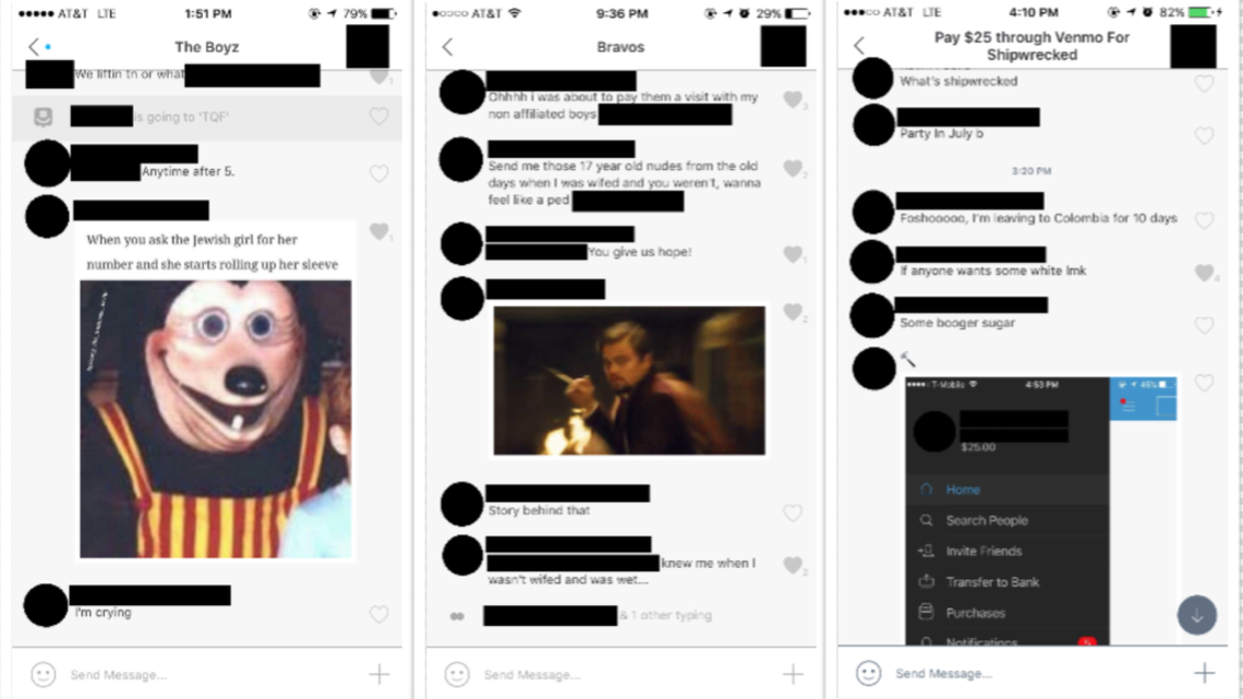 The screenshots, initially sent to school administrators in July by an anonymous source, showed what appear to be multiple non-consensual nude images of women, references to pedophilia, anti-Semitic and rape jokes, drug sales and insensitive comments about a sorority member who died this summer.