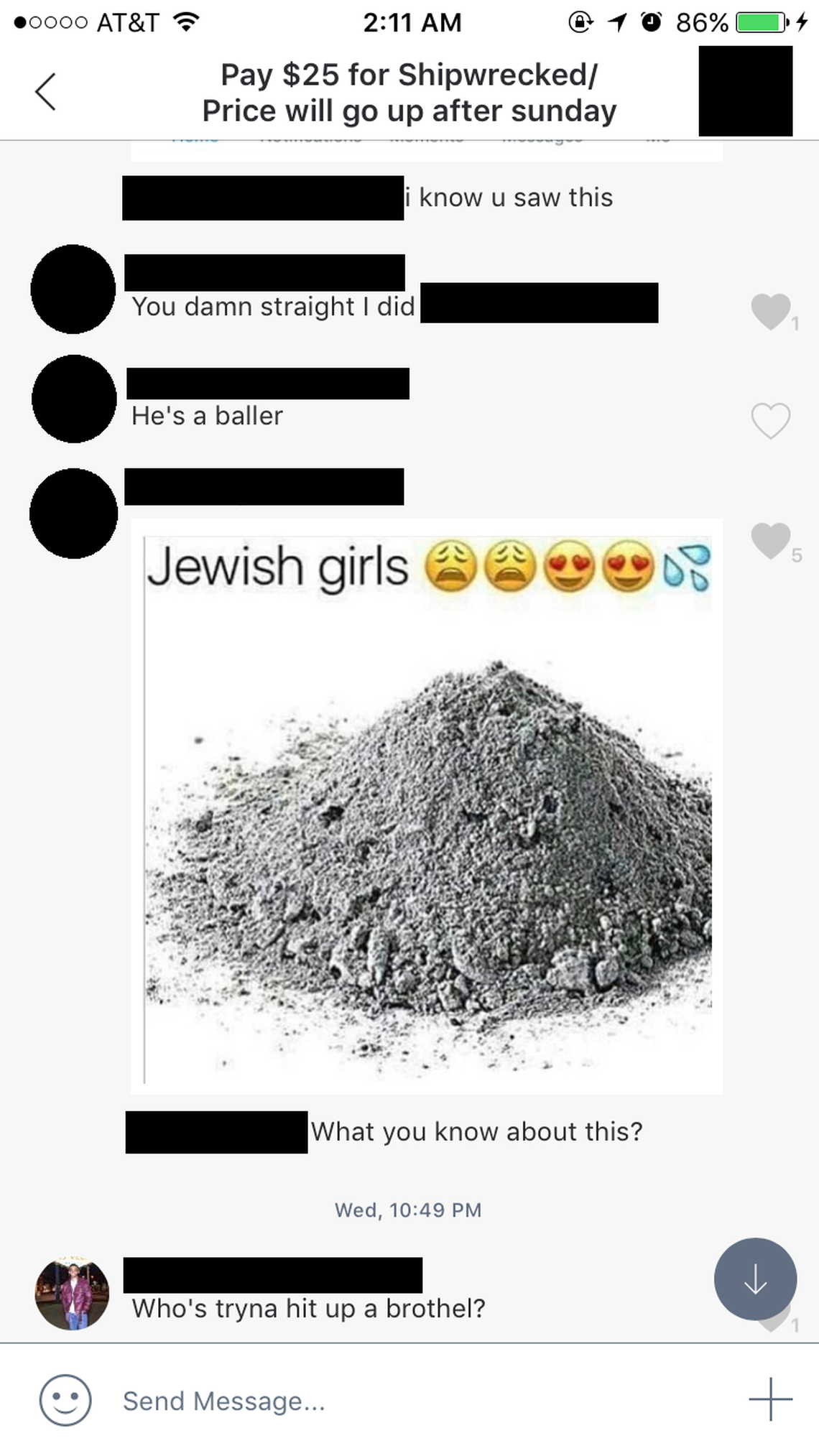 Group members shared anti-Semitic memes that referenced the Holocaust, made jokes that “it’s not rape if she enjoys it,” called sorority sisters “sluts” and talked about buying cocaine and Adderall. One shared picture appears to show two naked men shotgunning cans of beer.