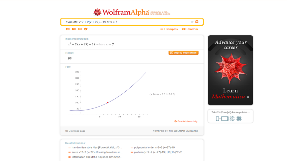 Looking for a little more instruction on a complicated topic? Students can use WolframAlpha to walk through formulas step-by-step, quiz themselves on presidents or current world news. Start by typing in your question or subject and watch as WolframAlpha searches through its database and algorithms to compute the answer. The answer has source notes, suggested related questions and links to more information.