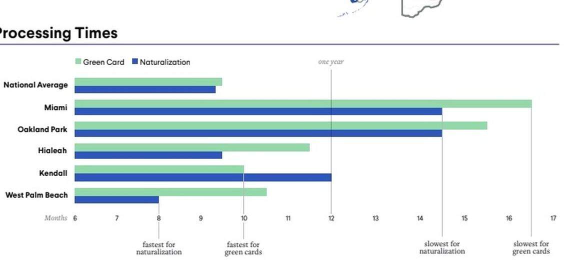 The Miami and Oakland Park field offices will keep you waiting the longest. Both are the slowest for green cards and naturalization processing.