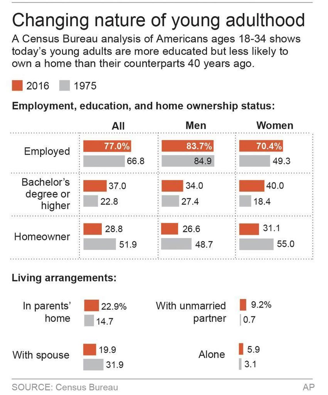 The U.S. Census Bureau released a study Wednesday looking at people ages 18-34 in both 1975 and 2016 and found several major economic and behavioral differences – including that millennials tend to be more educated than previous generations but are much less likely to own a home.