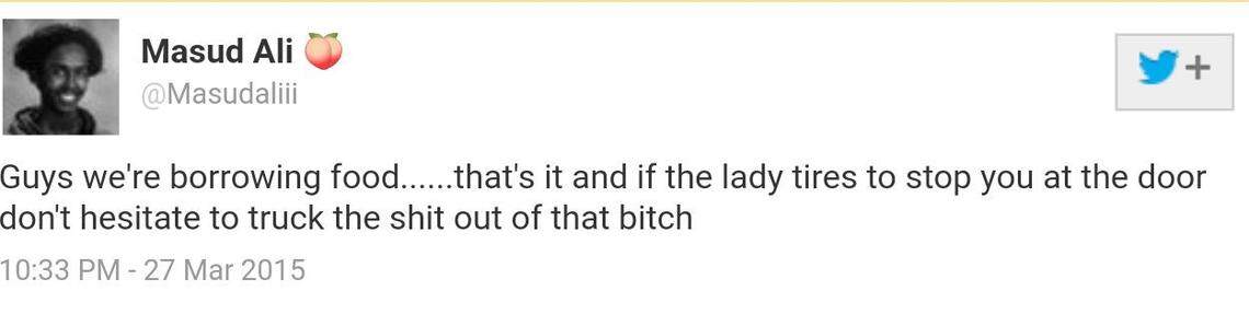 Another post read: “Guys we’re borrowing food... that’s it. And if the lady tries to stop you at the door don’t hesitate to truck the sh-- out of that bi---.”