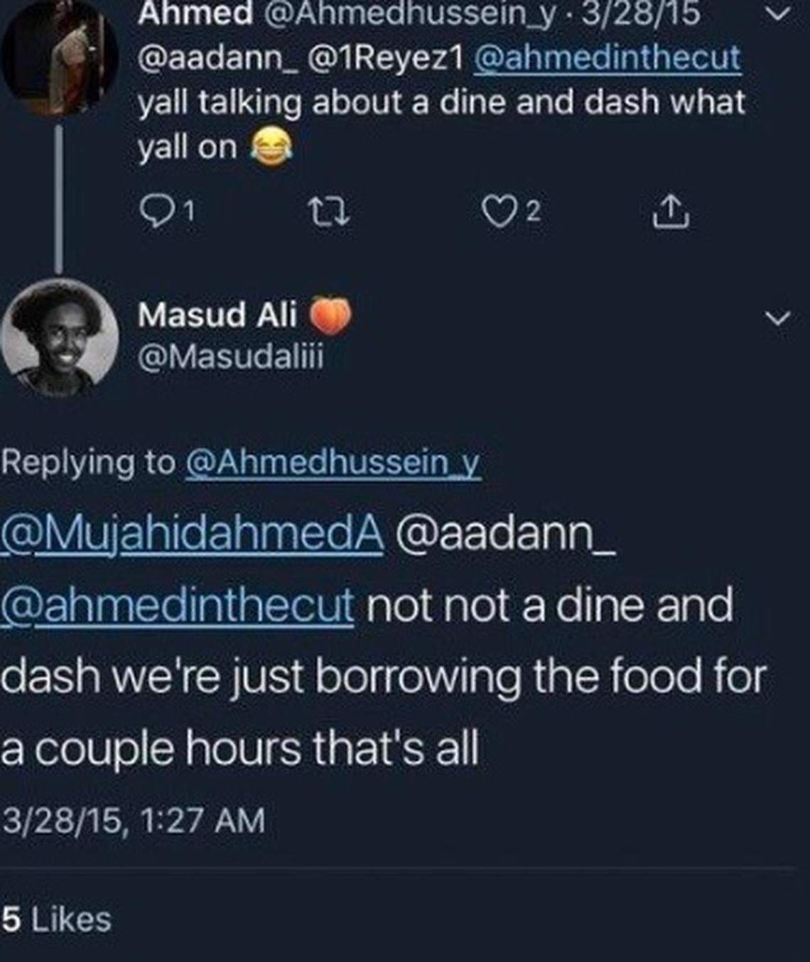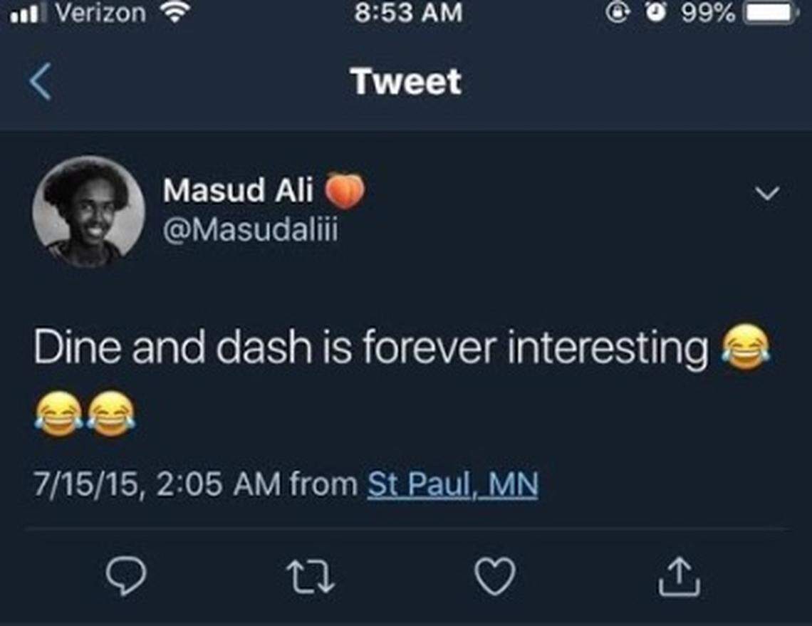 “Dine and dash is forever interesting,” Masud posted in 2015. He has since deleted the posts.