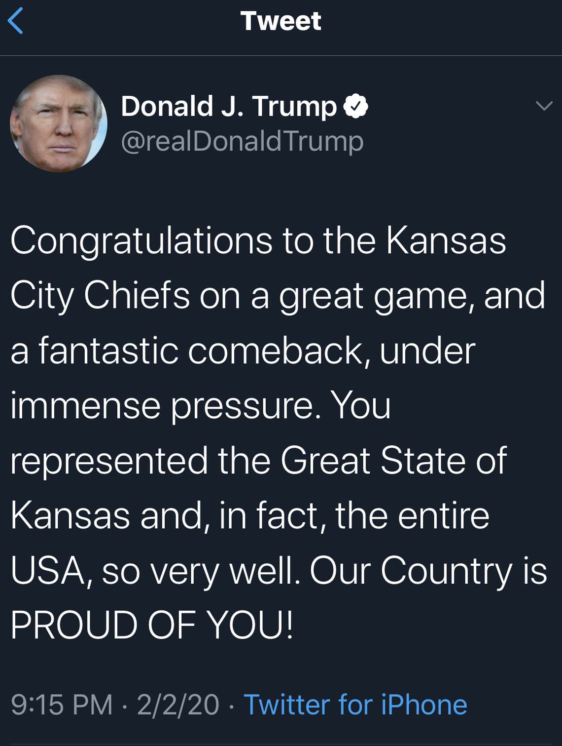 “Congratulations to the Kansas City Chiefs on a great game, and a fantastic comeback, under immense pressure. You represented the Great State of Kansas and, in fact, the entire USA, very well. Our country is PROUD OF YOU!” Trump tweeted after the Chiefs’ 31-20 comeback win over the San Francisco 49ers at Super Bowl LIV in Miami.
