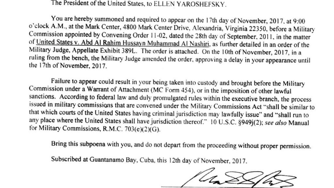 Chief war court prosecutor Army Brig. Gen. Mark Martins ordered the professor, Ellen Yaroshefsky, to report to war court headquarters in Alexandria, Virginia, at 9 a.m. Friday to testify by video-link to the Camp Justice court compound here.