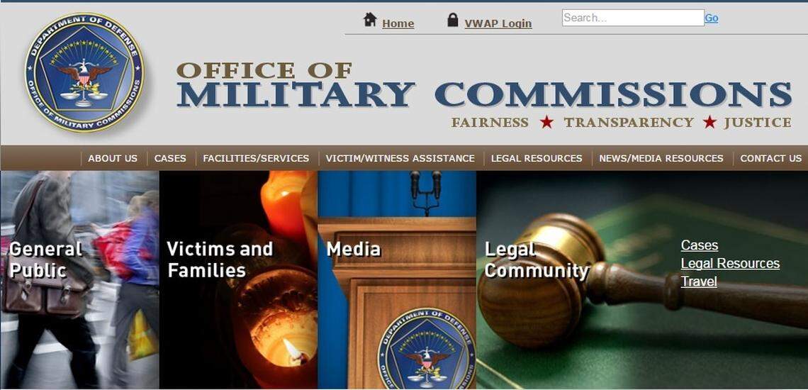 The court has its own website, built by the Department of Defense beginning in 2010 with a $487,369 development contract. Its motto is “Fairness * Transparency * Justice.” Intelligence agencies control the release of the pleadings, decisions and orders. Lawyers, and even the judge, file their documents with a special military commissions clerk who withholds them from the public while they circulate throughout the U.S. Intelligence Community to black out classified or sensitive portions (or all) of the documents before they are posted at the website. Pentagon regulations say the scrubs are to be complete within business days of the filing but often the process takes much longer than that. Other pockets of the website link to video of Pentagon press conferences related to the war crimes trials and a guide to the office spaces arrayed around the tent and trailer park compound.