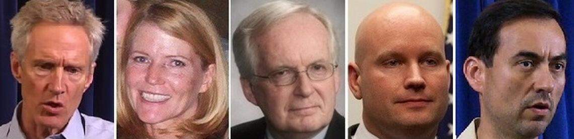 Army Brig. Gen. Mark Martins, left, the chief war crimes prosecutor since July 2011, has named himself and eight other prosecutors to the case. The lead 9/11 case prosecutors, or trial counsel, are retired Army Col. Robert Swann, formerly the Pentagon’s chief prosecutor for military commissions, and Edward Ryan, a civilian attorney with the Department of Justice. Both men had the case during the Bush era. Deputy trial counsel include Clayton G. Trivett Jr., a reserve Navy lieutenant commander and Jeffrey Groharing, a reserve U.S. Marine lieutenant colonel. Nicole Tate, a civilian, is an assistant trial counsel, as are Air Force Maj. Christopher Dykstra, Army Capt. Neville Dastoor and Marine Maj. Benjamin Mills. The general for years was the most public voice, and face, of the war court. Then in November 2017, he stopped giving news briefings and holding press conferences.