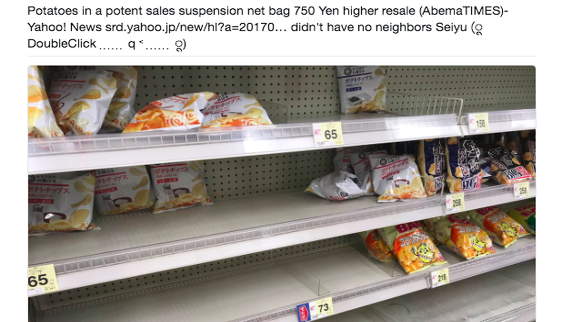 Like the milk and bread aisles in American grocery stores during the run-up to a snowstorm, Japanese stores have empty shelves in the potato chip aisle. Japanese Twitter users have posted pictures of the empty shelves — as well as pictures of their new stockpiles of the chips.
