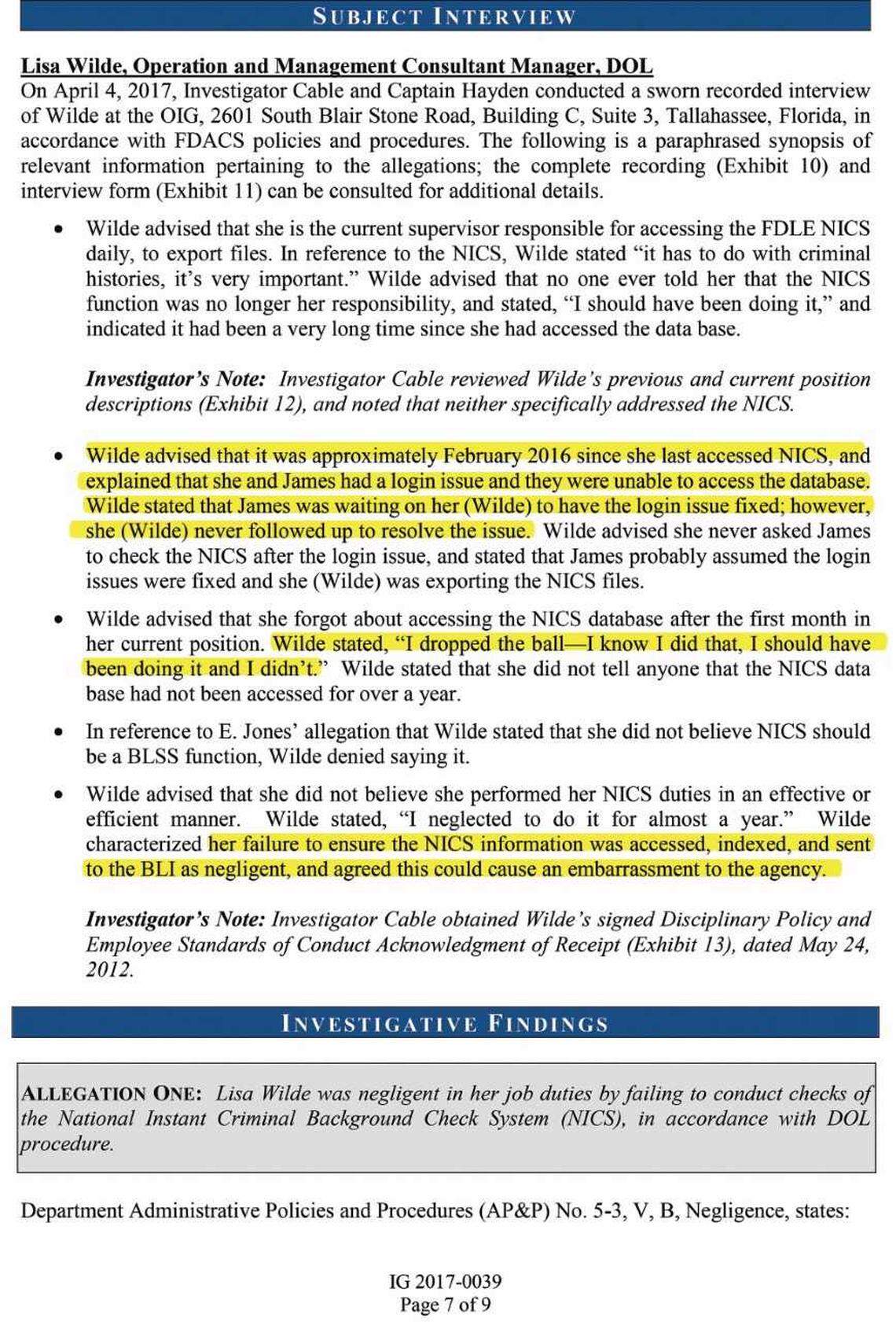 On April 7, 2016, Wilde reported to the Florida Department of Law Enforcement that her log-in to the background check system wasn’t working. But the investigation said she didn’t follow up after she continued to experience problems .