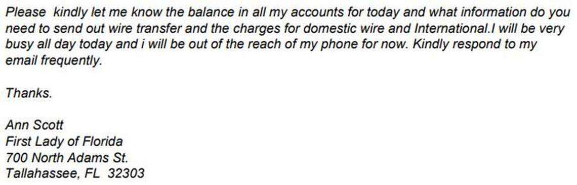 The wire transfer scam against Ann Scott was attempted a second time in 2014 when her Gmail account was compromised for a second time, FDLE said. Wire transfers totaling $397,330 were requested. At one point, the Scotts’ daughter, Allison, opened a version of the spoofed email.