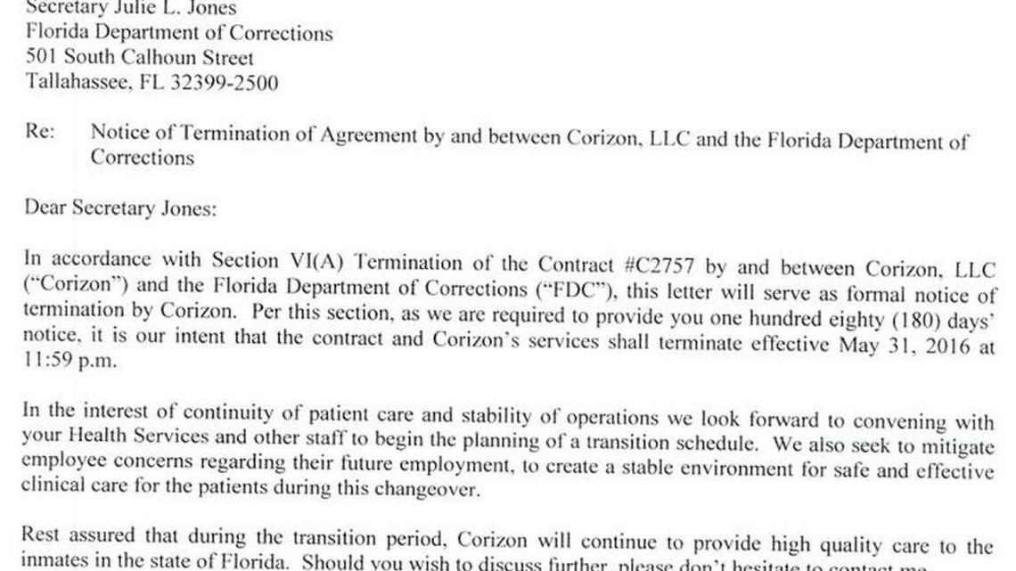The decision by the Tennessee-based company to exercise its right to terminate the contract that was scheduled to expire in 2018 came as the Florida Department of Corrections was attempting to renegotiate the agreement amid reports of inmate maltreatment, chronic understaffing and rising numbers of unnatural inmate deaths.