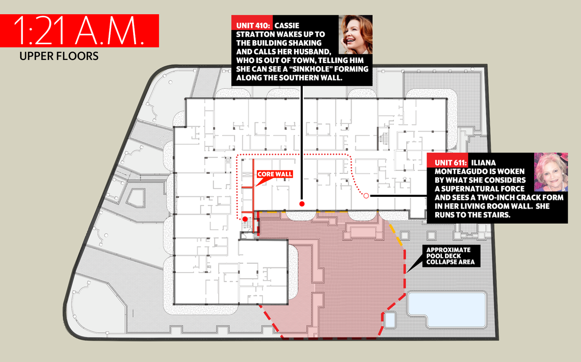 The deck collapse also woke Cassie Stratton in Unit 410, a fourth-floor apartment with a south-facing balcony overlooking the pool deck. At 1:20 a.m., Stratton called her husband, Mike, who was out of town, and told him the building was shaking. She thought it was an earthquake and went to investigate.