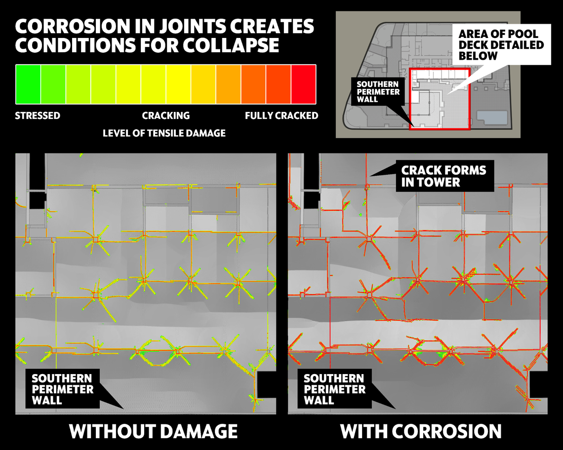 While it’s too soon to say with certainty what happened and new details could still emerge that might point to a different origin, nine engineers who reviewed the Herald’s findings all agreed that an initial failure of steel reinforcement along the southern edge of the pool deck was a plausible initiation point.