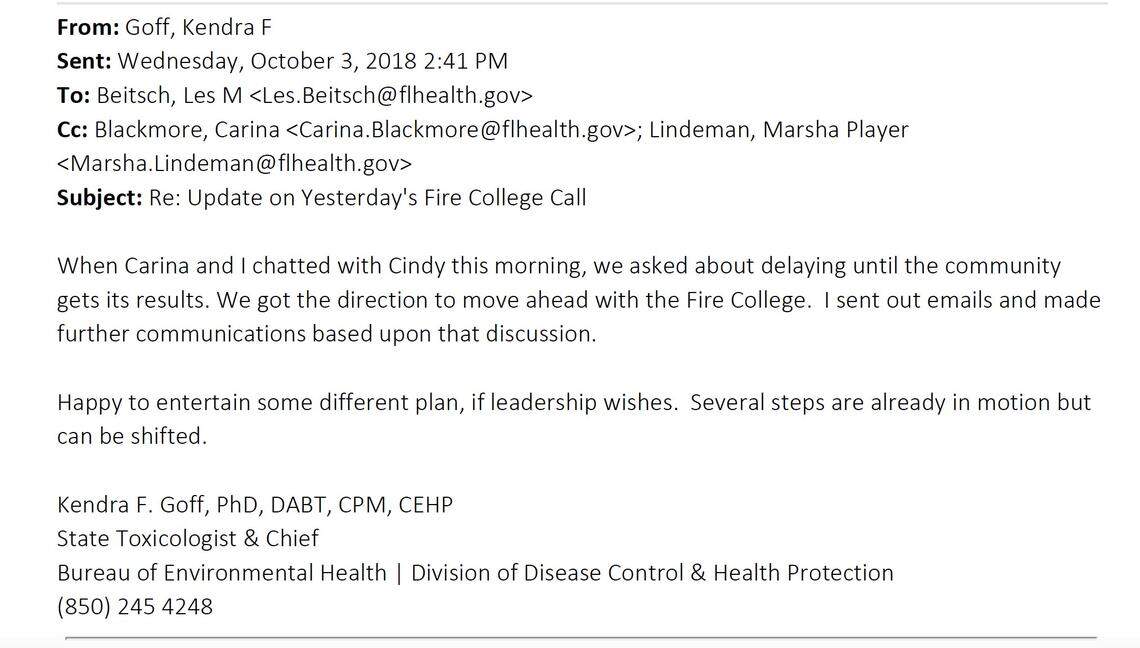 It took about four months for state health officials to notify Lawson and others in the community about potentially elevated levels of the chemicals, emails obtained by the Herald/Times show. In September state health officials began discussing means of informing the Fire College, but it wasn’t until late October that they discussed notifying the rest of the nearby community. While state health officials debated for months how to word messages to those affected and put off informational open houses because of Hurricane Michael, neighbors bickered with local health officials asking when their water would be tested. Some preemptively began buying cases of water each week, fearing their own wells might be contaminated.