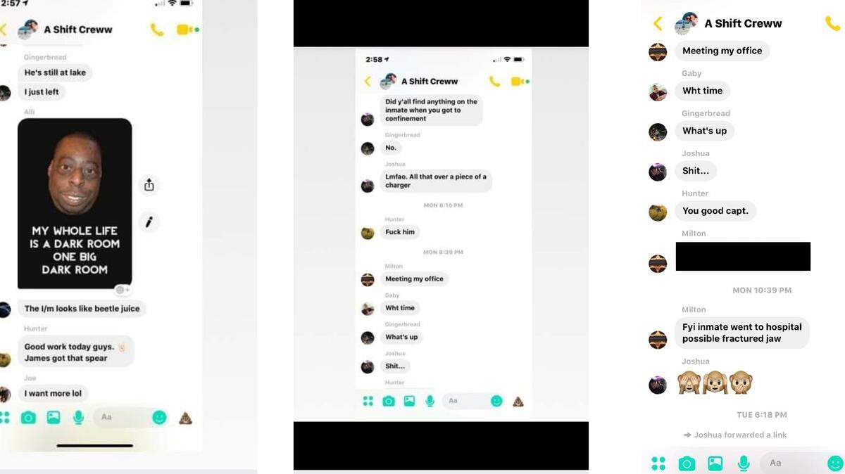 In the group chat, the officers appear to take pride in the damage they had inflicted on the inmate, who apparently ran from prison officials after he was discovered with a part of a cell phone charger, according to Grace and the leaked group chat.
