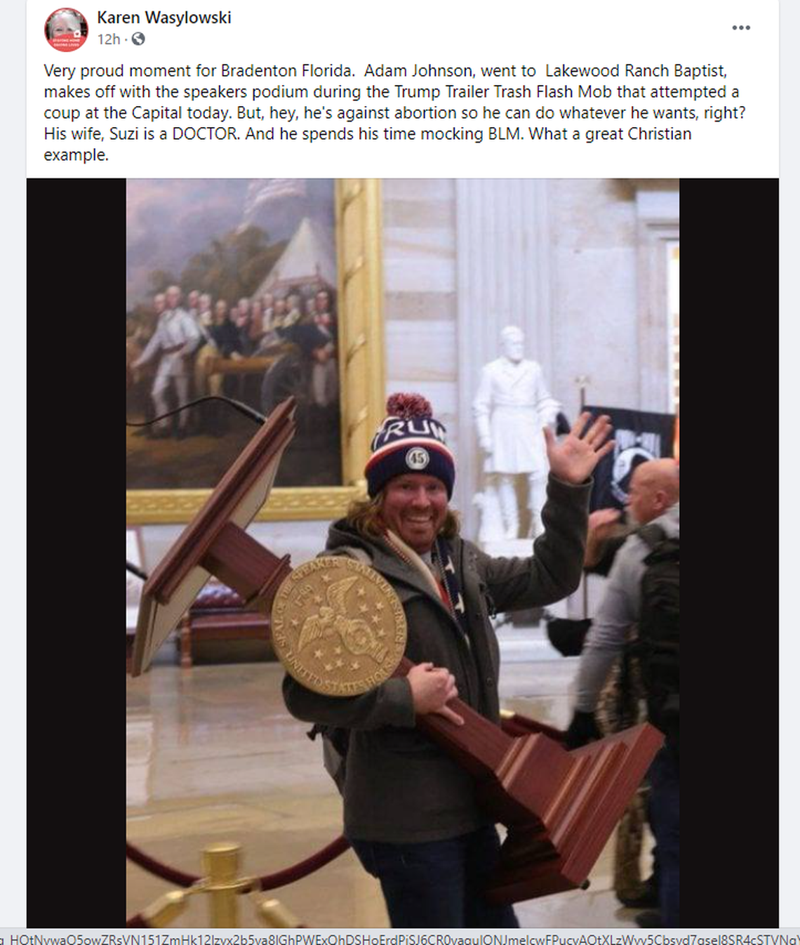 Adam Johnson, a 36-year-old Parrish man, smiled and waved as he was caught on camera carrying what appeared to be U.S. Speaker of the House Nancy Pelosi’s lectern as he walked through the U.S. Capitol Building with other rioters on Wednesday. It bears the official seal of the speaker of the House.