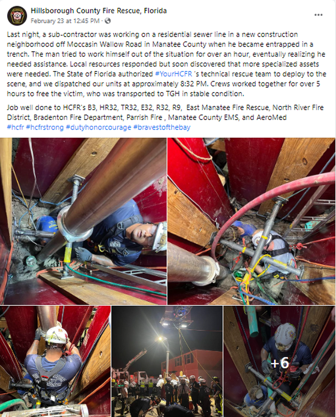 Among those helping in the rescue were the North River Fire District, Parrish Fire District, Manatee County EMS, Bradenton Fire Department, East Manatee Fire Rescue and Hillsborough Fire Rescue, the post said.
