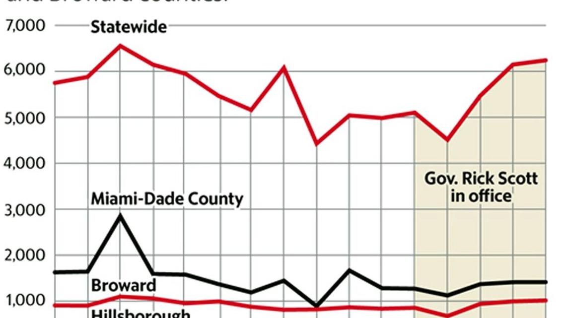 Miami-Dade lost a quarter of its county health revenue from the state during that period. Broward saw a reduction of 27 percent, Pinellas 27 percent and Hillsborough 31 percent. Hillsborough county health director Doug Holt did not respond to a request for comment.