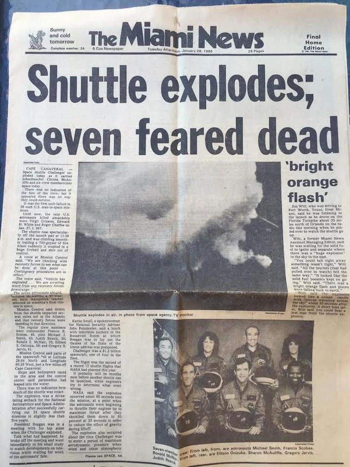 Reporter Ellen Livingston witnessed the explosion of the shuttle Challenger from Kennedy Space Center. As the Miami Herald’s higher education writer, Livingston was sent to cover the participation of schoolteacher Christa McAuliffe. It was the first time she had ever watched a space shot. Tuesday night, 10 hours after the explosion, Livingston gave this account to staff writer Patrick May.