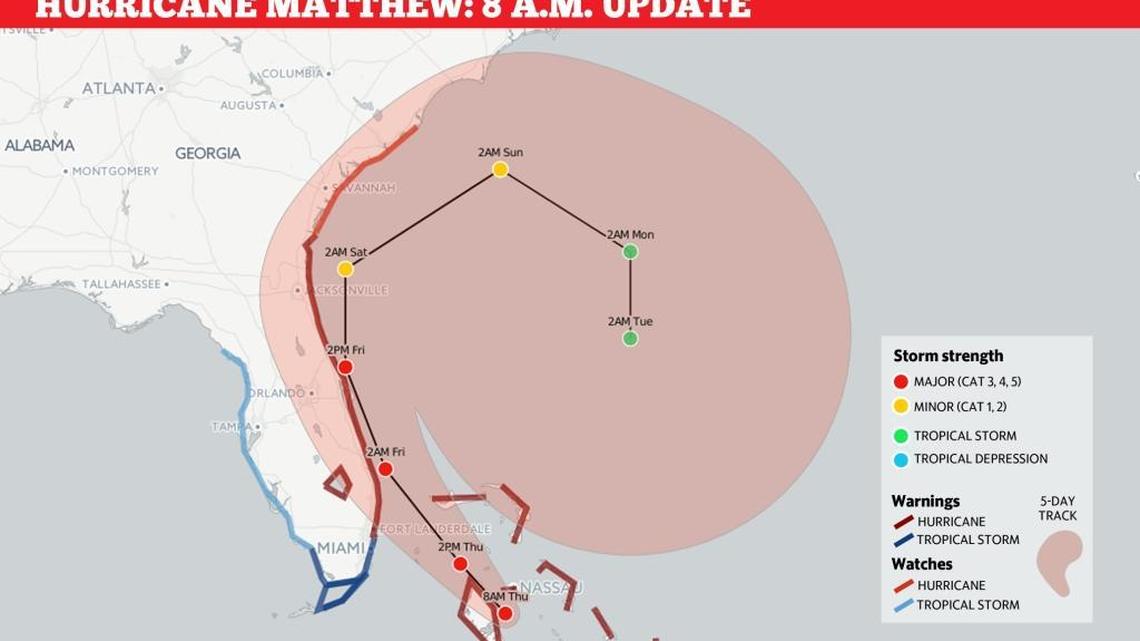 At 11 a.m. the hurricane was upgraded to a Category 4 storm, steering itself at 30 mph south of Nassau. It’s winds were howling at 125 mph, according to the National Hurricane Center. On the forecast track, the eye of Matthew should pass near Andros Island and New Providence in the northwestern Bahamas during the next few hours, Grand Bahama Island late Thursday, and move close to the east coast of Florida overnight, the Hurricane Center said.