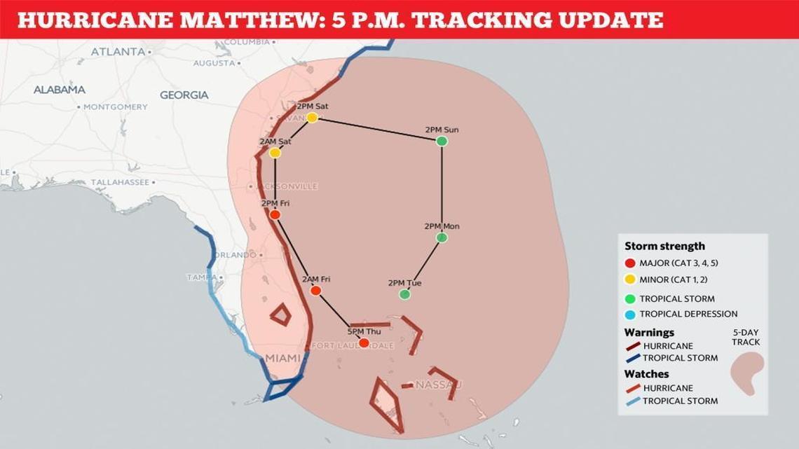 While it’s hardly certain, the 5 p.m. Thursday forecast shows Matthew likely skirting the East Coast, turning east around South Carolina and making a wide U-turn back south into the Atlantic Ocean.