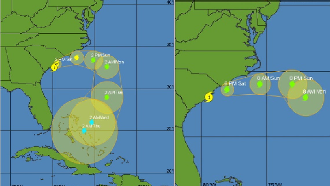 The 8 a.m. forecast showed the possibility of a tropical depression hitting the Bahamas early Tuesday morning. By 11 a.m., the map halted its predictions on Monday, when the center predicts Matthew will sink below a tropical storm.